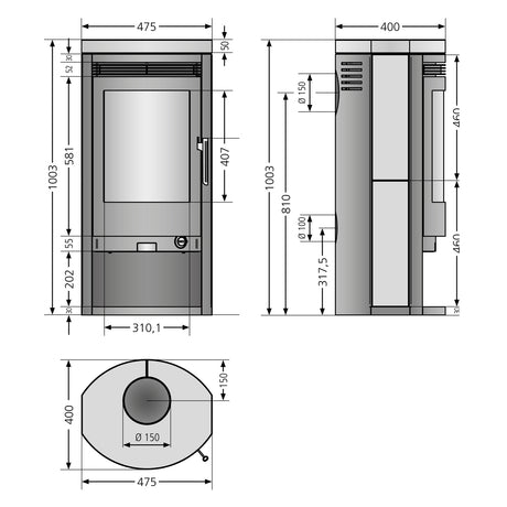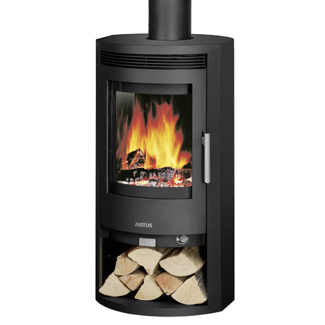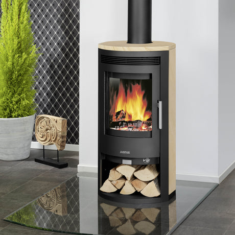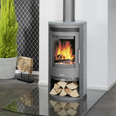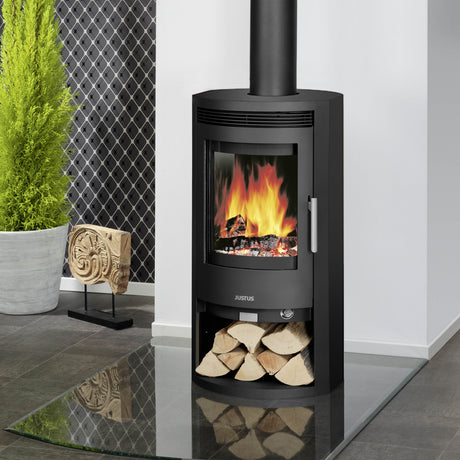 Die platzsparende Form ermöglicht es, den Ofen als Blickfang in Wohnküchen, Wohnzimmern oder Schlafbereichen zu platzieren. Kombiniert mit einem niedrigen Holzvorrat oder einem dekorativen Holzlager entsteht eine harmonische, wohnliche Atmosphäre.