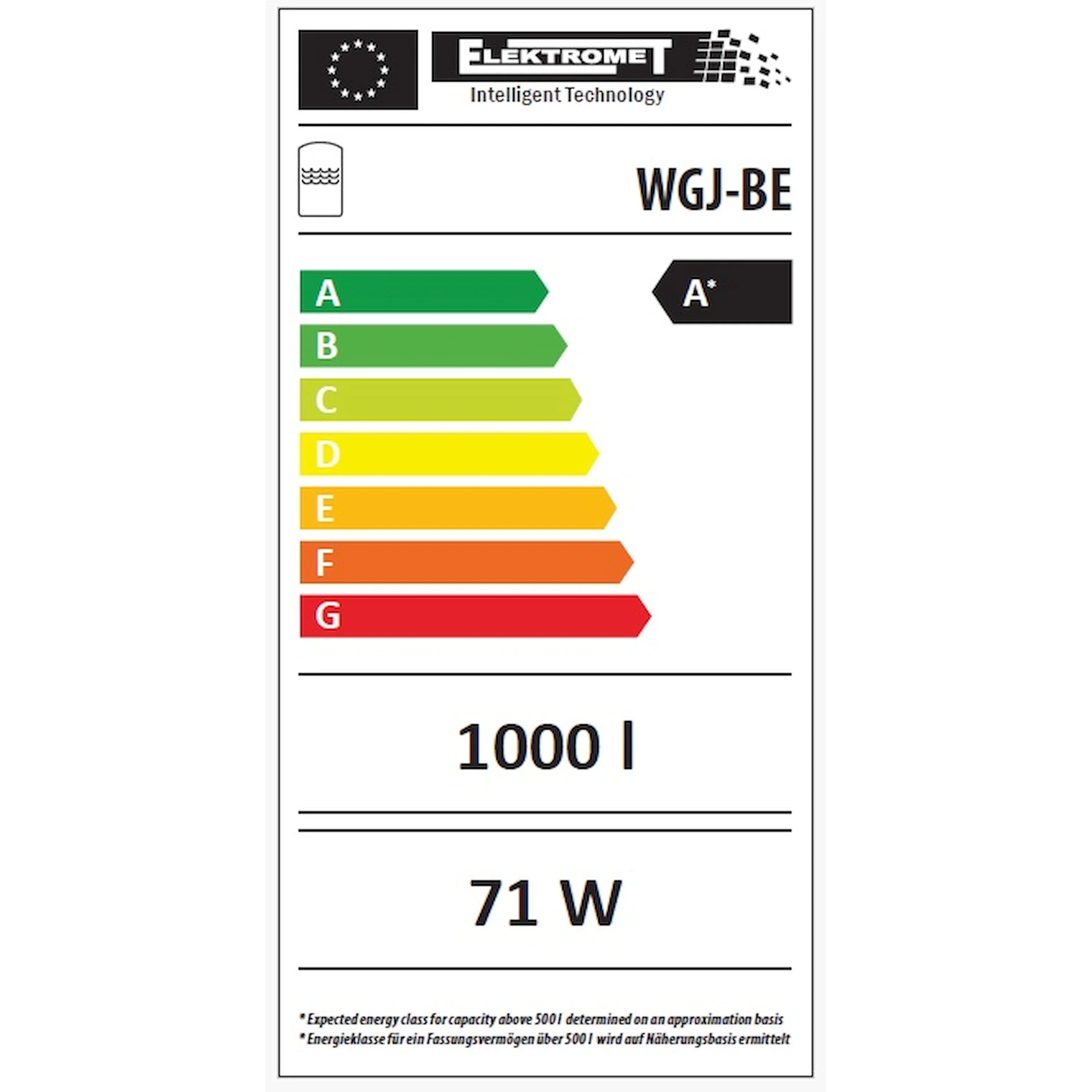 WGJ-BE 800: Objem zásobníku cca 710 l, ztráty v klidovém stavu cca 62 W, ​​hmotnost ~143 kg. WGJ-BE 1000: Objem zásobníku cca 830 l, ztráty v klidovém stavu cca 71 W, hmotnost ~160 kg. Maximální provozní tlak: 0,3 MPa; Maximální provozní teplota: 80 °C.
