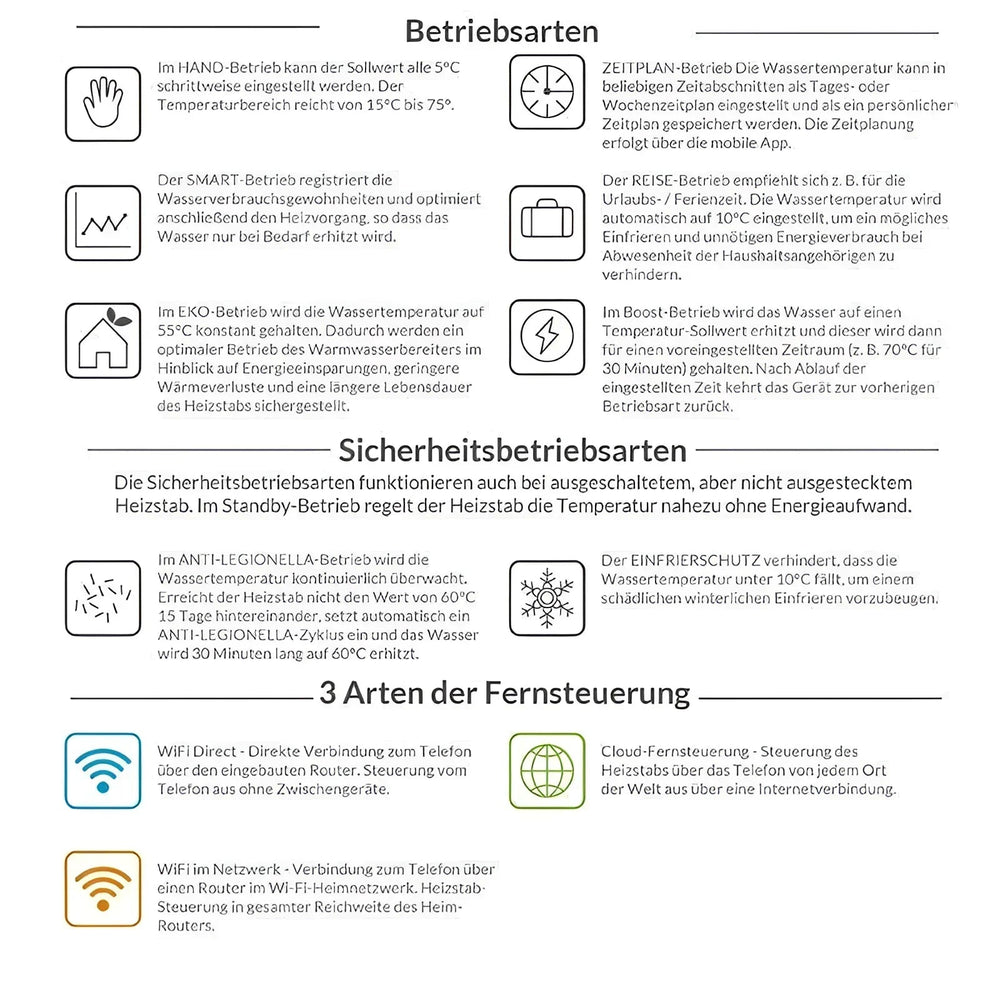 Datorită domeniilor sale versatile de aplicare, elementul de încălzire este un plus ideal pentru sistemele moderne de încălzire și apă caldă, care se concentrează pe flexibilitate și eficiență. moduri, tija de încălzire adaptată optim nevoilor individuale. Printre altele, permite controlul manual, precum și modul inteligent, în care dispozitivul se adaptează automat la obiceiurile tale.