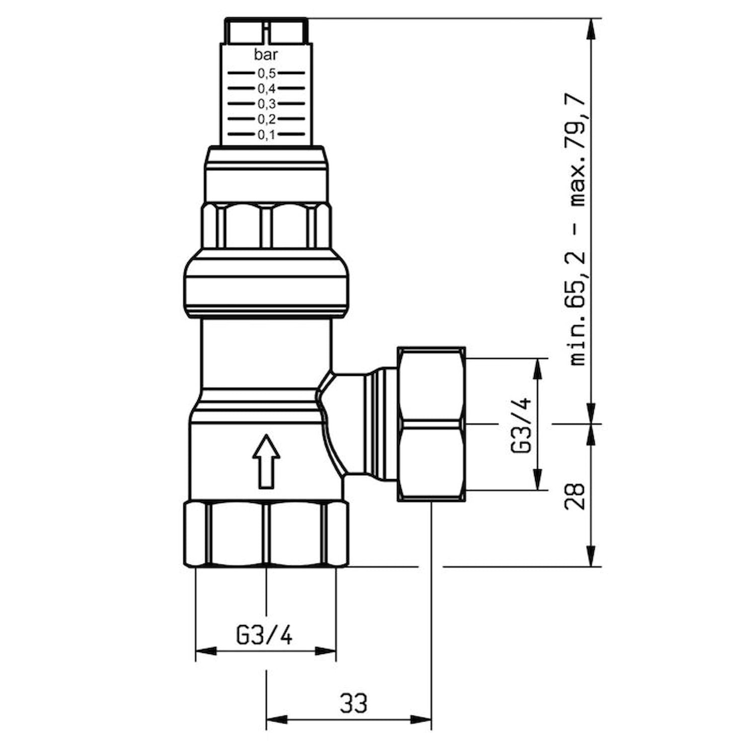 Delovno temperaturno območje: maks. 95 °C (kratkotrajno do 120 °C). Delovni tlak: maks. 6 barov. Diferenčni tlak brezstopenjsko nastavljiv: 0,1/0,5 bara. Material ohišja: medenina. Priključki: Vhod notranji navoj G¾, izhod ploščato tesnilni vijačni priključek z matico G¾.
